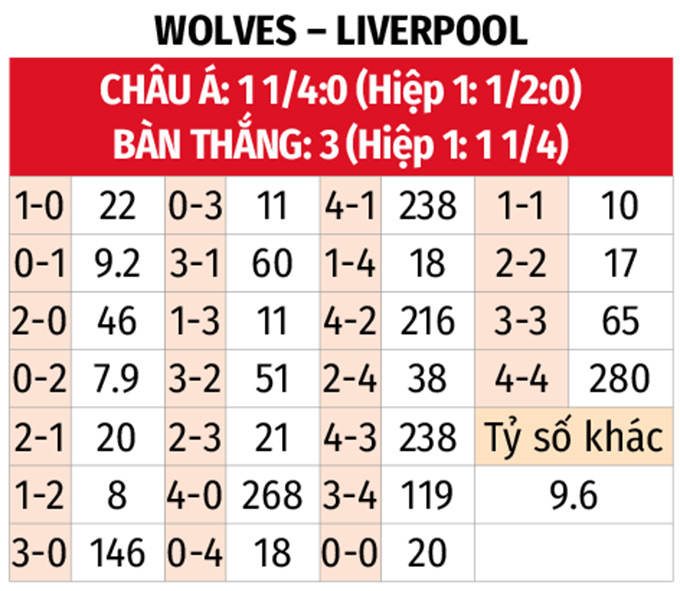 - Tối đa 1 bàn hiệp 1: 6 trận liên tiếp gần đây của Wolves chỉ xuất hiện 1 bàn thắng trong hiệp đầu tiên. 10/11 trận sân khách vừa qua của Liverpool cũng có nhiều nhất 1 bàn trước giờ nghỉ, với 8 trận hòa 0-0. Chưa kể, 13/14 trận đối đầu gần nhất trên sân Molineux cũng chi có không quá 1 bàn trong 45 phút đầu.