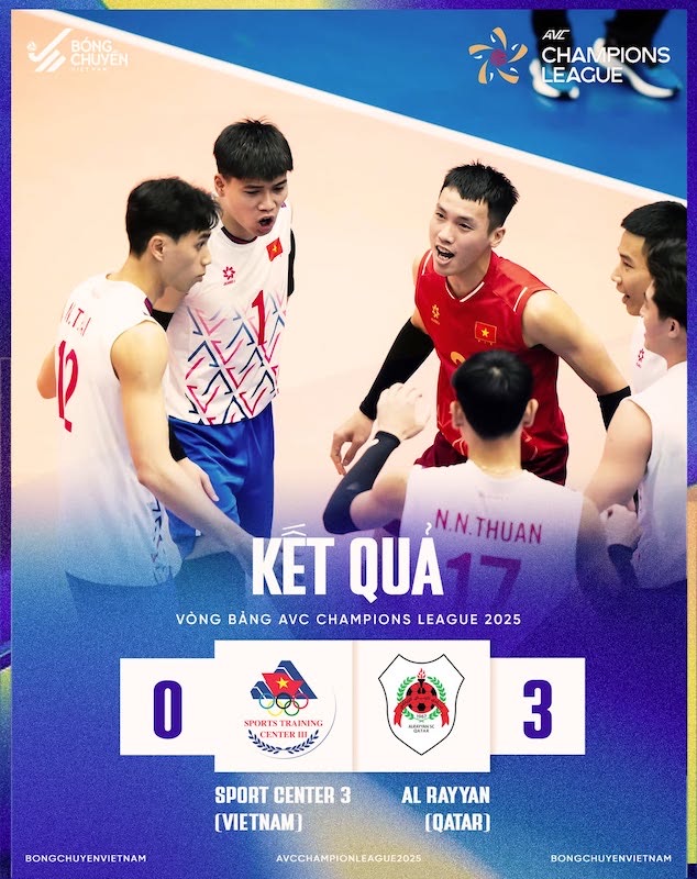 Sáng 13.5, đội tuyển bóng chuyền nam Việt Nam (Sport Center 3) đã thất bại 0-3 trước Al Rayyan tại vòng bảng AVC Champions League 2025.